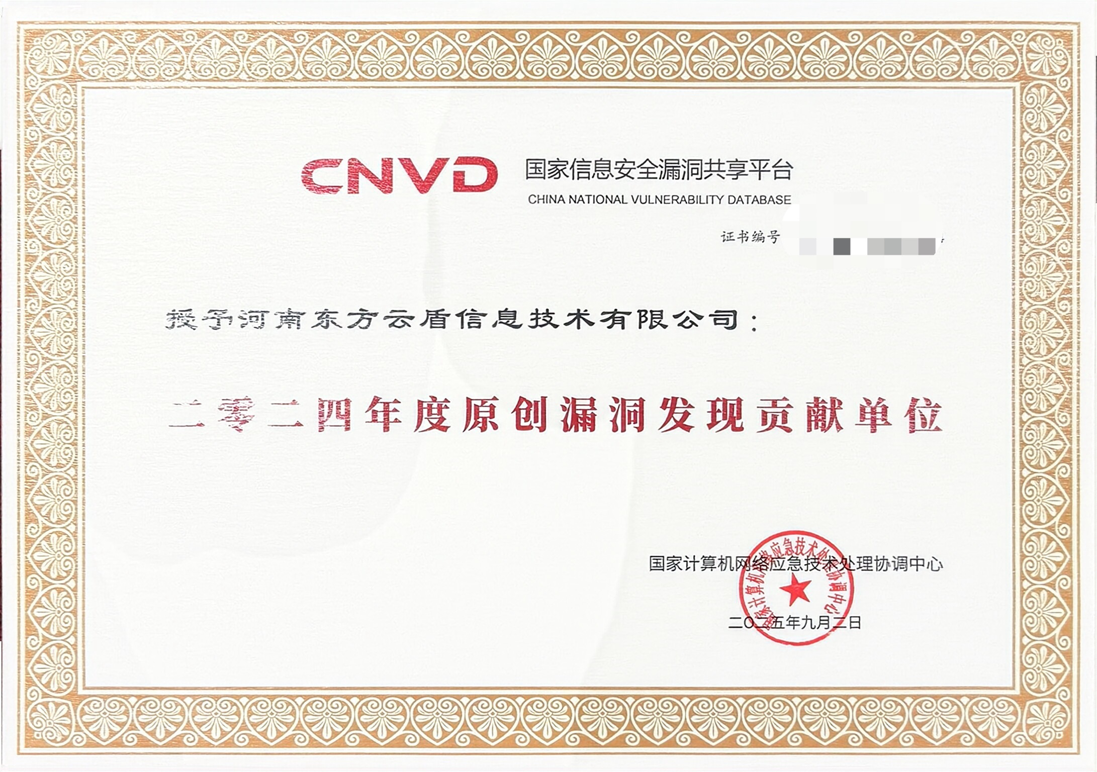 2025年9月16日,河南东方云盾信息技术有限公司成功获得由国家信息安全漏洞共享平台(CNVD)颁发的“CNVD技术支撑单位”证书与“2024年度原创漏洞发现贡献单位”证书。这一重要荣誉不仅是对公司技术实力与创新能力的权威认可,更是对其在维护国家网络安全、推动行业漏洞治理方面所作突出贡献的高度肯定。