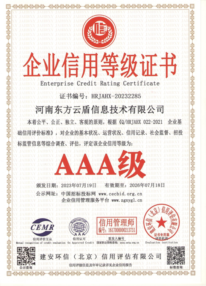 企业信用等级证书 信息安全管理体系认证证书 信息技术服务管理体系认证证书